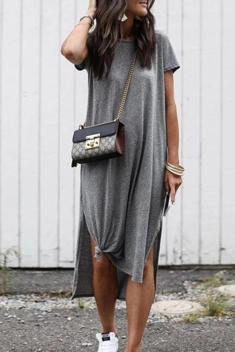 Casual Solid Pocket Slit O Neck Dresses(3 colors)
