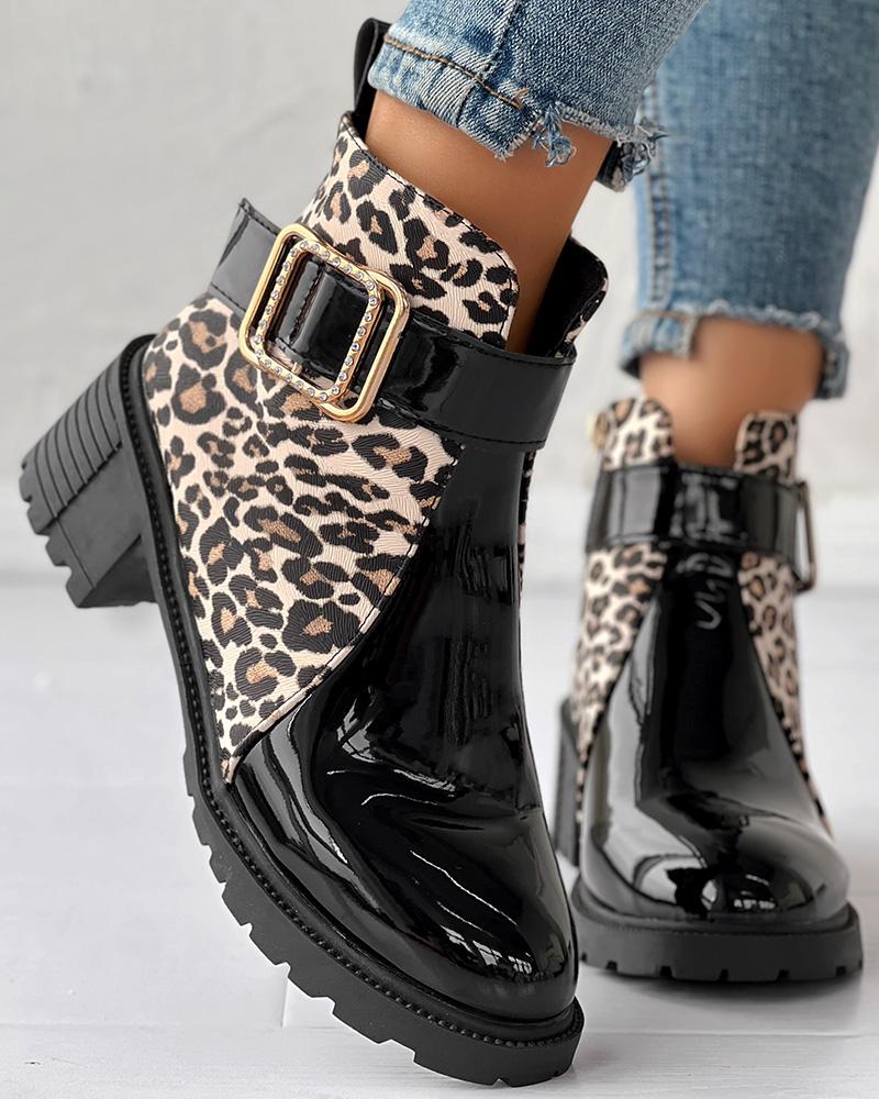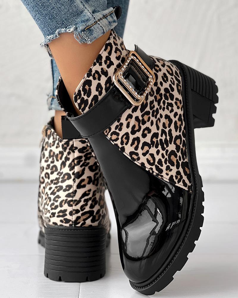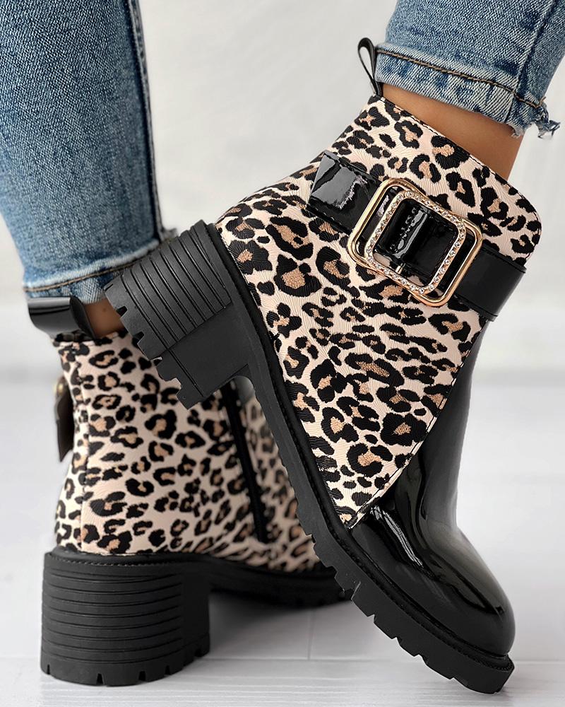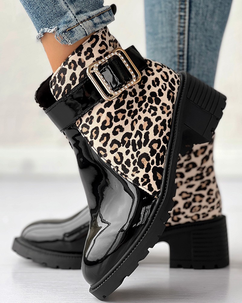 • Leopard Print Buckled Side Zipper Ankle Boots